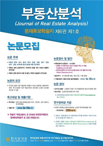 Çѱ¹°¨Á¤¿øÀº ºÎµ¿»ê½ÃÀå Àü¹® °ø°ø±â°üÀ¸·Î¼ ¿¬±¸ ºÐ¾ßÀÇ Àü¹®¼º Á¦°í ¹× ÇÐ°è µî°úÀÇ ÇмúÀû ±³·ù¸¦ È®´ëÇϱâ À§ÇØ ¿À´Â 4¿ù 30ÀÏ ¹ß°£¿¹Á¤ÀÎ ÇмúÁö ‘ºÎµ¿»êºÐ¼®(Journal of Real Estate Analysis)’ Á¦6±Ç Á¦1È£¿¡ °ÔÀçÇÒ ³í¹®À» ¿À´Â 3¿ù 18ÀϱîÁö ¸ðÁýÇÑ´Ù°í ¹àÇû´Ù.