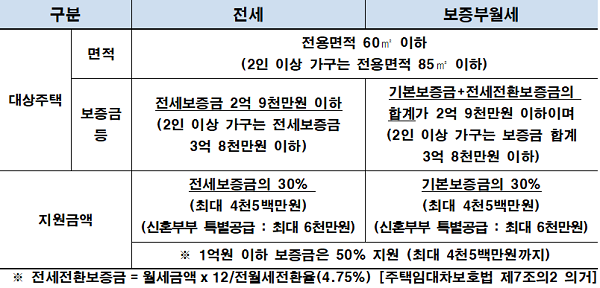 Áö¿ø ´ë»ó ÁÖÅÃÀº ¼ø¼ö Àü¼¼ÁÖÅðú º¸ÁõºÎ ¿ù¼¼ÁÖÅÃÀÌ´Ù. º¸Áõ±Ý Çѵµ´Â 1ÀÎ °¡±¸ÀÇ °æ¿ì ¼ø¼ö Àü¼¼ÀÇ Àü¼¼±Ý ¶Ç´Â º¸ÁõºÎ¿ù¼¼ÀÇ ±âº»º¸Áõ±Ý°ú Àü¼¼Àüȯº¸Áõ±ÝÀÇ ÇÕÀÌ 2¾ï9000¸¸ ¿ø ÀÌÇÏ, 2ÀÎ ÀÌ»óÀÇ °¡±¸ÀÇ °æ¿ì ÃÖ´ë 3¾ï8000¸¸ ¿ø ÀÌÇÏÀÇ ÁÖÅÃÀÌ´Ù. ´ë»óÁÖÅÃÀÇ Àü¿ë¸éÀûÀº 1ÀÎ °¡±¸´Â 60§³ ÀÌÇÏ, 2ÀÎ ÀÌ»ó °¡±¸´Â 85§³ ÀÌÇÏ´Ù.