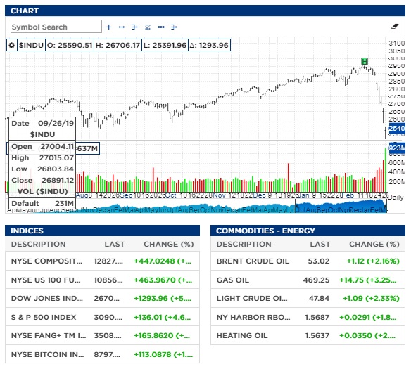Áö³ 2ÀÏ(ÇöÁö½Ã°£) ´º¿åÁõ±Ç°Å·¡¼Ò(NYSE)¿¡ µû¸£¸é ´Ù¿ìÁ¸½º»ê¾÷Æò±ÕÁö¼ö´Â Àü °Å·¡ÀϺ¸´Ù 1293.96p(5.09%) ±ÞµîÇÑ 2¸¸6703.32¿¡ ÀåÀ» ¸¶°¨Çß´Ù. 2009³â 3¿ù ÀÌÈÄ ¾à 11³â ¸¸¿¡ °¡Àå Å« ÀÏÀÏ »ó½Â·üÀ» ±â·ÏÇß´Ù.