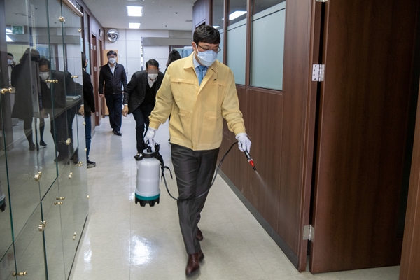 [¾ÆÀ¯°æÁ¦=Á¶Çö¿ì ±âÀÚ] °³²±¸ÀÇȸ À̰ü¼ö ÀÇÀåÀÌ ÀÌ´Þ 6ÀÏ ¿ÀÀü Äڷγª19ÀÇ È®»ê¹æÁö¸¦ À§ÇØ °³²±¸¹Îȸ°ü û»ç °÷°÷À» µ¹¸ç ¹æ¿ª¼Òµ¶À» ½Ç½ÃÇß´Ù.