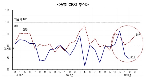 Çѱ¹°Ç¼³»ê¾÷¿¬±¸¿ø(ÀÌÇÏ °Ç¼³¿¬)Àº Áö³ 3ÀÏ ‘2020³â 2¿ù °Ç¼³±â¾÷°æ±â½Ç»çÁö¼ö’¸¦ ¹ßÇ¥Çß´Ù. ÇØ´ç º¸°í¼¿¡¼ °Ç¼³¿¬Àº “2¿ù °Ç¼³±â¾÷ °æ±â½Ç»çÁö¼ö(CBSI)°¡ Àü¿ù ´ëºñ 3.2p Ç϶ôÇÑ 68.9¸¦ ±â·ÏÇß´Ù”°í ¹ßÇ¥Çß´Ù.