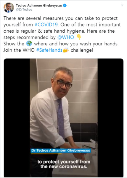 | ¡ã Å¿öµå·Î½º ¾ÆµåÇϳð °Åºê·¯¿©¼ö½º ¼¼°èº¸°Ç±â±¸(WHO) »ç¹«ÃÑÀåÀÌ ÀÚ½ÅÀÇ Æ®À§Å͸¦ ÅëÇØ ¹æÅº¼Ò³â´Ü(BTS) µî À¯¸íÀλ翡°Ô ½ÅÁ¾ Äڷγª¹ÙÀÌ·¯½º °¨¿°Áõ(Äڷγª19) ¿¹¹æÀ» À§ÇÑ ‘¼Õ ¾Ä±â 縰Áö’ µ¿ÂüÀ» Ã˱¸Çß´Ù. <Á¦°ø=°Åºê·¯¿©¼ö½º »ç¹«ÃÑÀå Æ®À§ÅÍ Ä¸Ã³> |