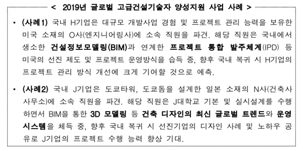 ÀÌ¿¡ µû¶ó ±¹ÅäºÎ´Â 2019³âºÎÅÍ °Ç¼³ °ü·Ã ÇØ¿Ü À¯¼ö ±â¾÷¿¡ °Ç¼³±â¼úÀÎÀ» ÆÄ°ß, ¼±Áø ±â¾÷¹®È üµæ ¹× ¾÷¹«¿ª·®À» °ÈÇÒ ¼ö ÀÖµµ·Ï ±Û·Î¹ú °í±Þ°Ç¼³±â¼úÀÚ ¾ç¼ºÀ» Àû±Ø ÃßÁøÇϰí ÀÖ´Ù. »ç¾÷ÀÇ ½ÇÈ¿¼ºÀ» ³ôÀ̱â À§ÇØ Àü¹® Àη ¾ç¼º¿¡ ¾Ö·Î°¡ ÀÖ´Â Á߰ߤýÁß¼Ò±â¾÷¿¡°Ô ÇýÅÃÀÌ µ¹¾Æ°¥ ¼ö ÀÖµµ·Ï ÁßÁ¡ Áö¿øÇÒ °èȹÀÌ´Ù.