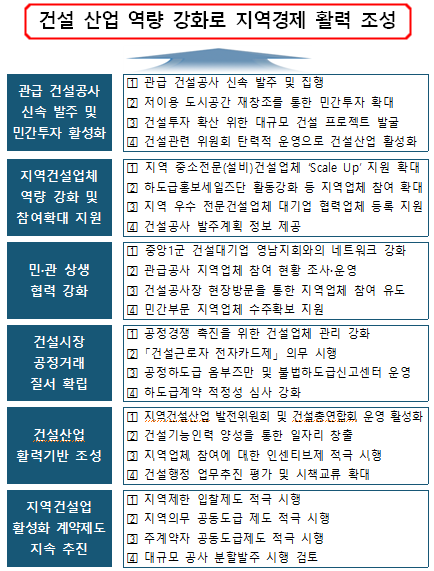 ¶ÇÇÑ Áö¿ª °Ç¼³¾÷ü °£ÀÇ °æÀï·ÂÀ» ³ôÀ̱â À§ÇØ Áö¿ªÁ¦ÇÑ ÀÔÂûÁ¦µµ, Áö¿ªÀǹ« °øµ¿µµ±Þ Á¦µµ, ÁÖ°è¾àÀÚ °øµ¿µµ±ÞÁ¦µµ¸¦ Àû±Ø ½ÃÇàÇØ Áö¿ª °Ç¼³¼öÁÖ¸¦ È®´ëÇÒ ¹æÄ§ÀÌ´Ù.