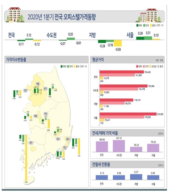 Áö³ 1ÀÏ Çѱ¹°¨Á¤¿øÀÌ ¹ßÇ¥ÇÑ ‘2020³â 1ºÐ±â ¿ÀÇǽºÅÚ °¡°Ýµ¿Çâ’ Á¶»ç°á°ú¿¡ µû¸£¸é Áö³´Þ(3¿ù) 9ÀÏ ±âÁØ ±¹³» ¿ÀÇǽºÅÚ ¸Å¸Å°¡°ÝÀº Áö³ÇØ 12¿ù 9ÀÏ¿¡ ºñÇØ 0.11% Ç϶ôÇß°í, Àü¼¼°¡°ÝÀº 0.12% »ó½ÂÇß´Ù. Áö¿ªº°·Î »ìÆìº¸¸é ¼¿ïÀÇ ¸Å¸Å°¡°ÝÀº ÀüºÐ±â 0.4%¿¡¼ 0.28%·Î Ãà¼ÒµÆ°í ¼öµµ±ÇÀº ÀüºÐ±â 0.03% »ó½Â¿¡¼ –0.07%·Î Ç϶ô ÀüȯµÆ´Ù.