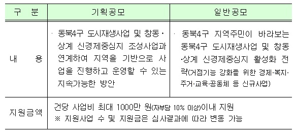 À̹ø °ø¸ð»ç¾÷Àº µ¿ºÏ4±¸ µµ½ÃÀç»ý»ç¾÷ ¹× ⵿¤ý»ó°è ½Å°æÁ¦Áß½ÉÁö Á¶¼º»ç¾÷¿¡ °ü½ÉÀÌ ÀÖ´Â ÁÖ¹Î, »óÀÎ, û³â, Ȱµ¿°¡, ¹Î°£´Üü µî ´©±¸³ª Âü°¡ÇÒ ¼ö ÀÖÀ¸¸ç, »ç¾÷´ë»óÁö ³» »ç¾÷Àå¤ýÁ÷Àå¤ýÇб³ µîÀÌ ÀÖ´Â »ýȰ±â¹ÝÀڷμ 3ÀÎ ÀÌ»óÀÇ ¸ðÀÓ(´ëÇ¥ 1ÀÎ)À̳ª ºñ¿µ¸®¹Î°£´Üü¤ýºñ¿µ¸®¹Î°£¹ýÀΤýÇùµ¿Á¶ÇÕ¤ý(¿¹ºñ) »çȸÀû ±â¾÷ ´©±¸³ª ½Åû °¡´ÉÇÏ´Ù.
