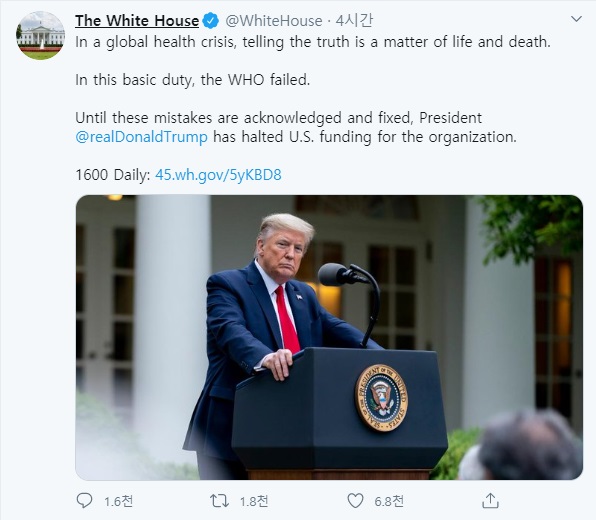 ¾Õ¼ Æ®·³ÇÁ ´ëÅë·ÉÀº Áö³ 14ÀÏ ¿¸° ±âÀÚȸ°ß¿¡¼ “WHOÀÇ À߸øµÈ ´ëÀÀÀÌ Äڷγª19ÀÇ ´ëÀ¯ÇàÀ¸·Î À̾îÁ³´Ù”¸é¼ °ü·Ã Á¶»ç°¡ ÁøÇàµÇ´Â µ¿¾È WHO¿¡ ´ëÇÑ ÀÚ±Ý Áö¿ø Áß´ÜÀ» Áö½ÃÇß´Ù.