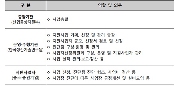 ÇØ´ç Áö¿ø »ç¾÷Àº »ê´Ü ³» Áß¼Ò¤ýÁß°ß »ç¾÷ÀåÀ» ´ë»óÀ¸·Î »ý»ê ´Ü°èºÎÅÍ 4´ë ¿À¿°¹°ÁúÀÎ ¡ã¹Ì¼¼¸ÕÁö ¡ã¿Â½Ç°¡½º ¡ãÆó±â¹° ¡ãÀ¯ÇØÈÇй°Áú µîÀ» ¿øÃµÀûÀ¸·Î °¨ÃàÇϱâ À§ÇØ Á¦Á¶ °øÁ¤À» Àü¹®°¡°¡ Áø´ÜÇϰí, ÀÌ¿¡ µû¸¥ ¸ÂÃãÇü ģȯ°æ »ý»ê ¼³ºñ º¸±ÞÀ» Áö¿øÇÏ´Â »ç¾÷ÀÌ´Ù.