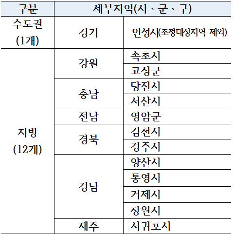 À̹ø ¹ßÇ¥¿¡¼´Â ºÎ»ê±¤¿ª½Ã ºÎ»êÁø±¸¿Í °æºÏ ¿µÃµ½Ã°¡ Á¦¿ÜµÇ°í Ãß°¡µÈ °÷ÀÌ ¾ø¾î ¹ÌºÐ¾ç°ü¸®Áö¿ªÀÌ 13°³ Áö¿ªÀ¸·Î ÁÙ¾ú´Ù. 13°³ Áö¿ªÀº °æ±â ¾È¼º½Ã, °¿ø ¼ÓÃʽäý°í¼º±º, Ãæ³² ´çÁø½Ã¤ý¼»ê½Ã µîÀÌ´Ù.