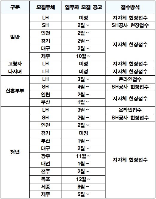 ¸ÅÀÔÀÓ´ëÁÖÅÃÀÇ ¼¼ºÎ °ø±ÞÁö¿ª ¹× ÀÔÁÖ ÀÚ°Ý, À¯Çüº° Á¢¼ö ÀÏÁ¤ µîÀº °¢ °ø°øÁÖÅà »ç¾÷ÀÚÀÇ ´©¸®Áý¿¡ °Ô½ÃµÈ °ø°í¹®À» ÅëÇØ È®ÀÎÇÒ ¼ö ÀÖ´Ù. ÀÔÁÖ Èñ¸ÁÀÚ´Â LH û¾à¼¾ÅÍ ¹× °ÅÁÖÁö¿ªÀÇ Áֹμ¾ÅÍ µî¿¡ ½ÅûÇÏ¸é µÈ´Ù.