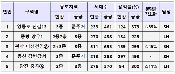 À̹ø ¼±µµ»ç¾÷ Èĺ¸Áö 5°÷¿¡ ´ëÇÑ »ç¾÷È¿°ú ºÐ¼® °á°ú, 5°³ ´ÜÁö ¸ðµÎ 1´Ü°è Á¾»óÇâÀ» Àû¿ëÇÏ´Â µî µµ½Ã°èȹ Àμ¾Æ¼ºê¸¦ ÅëÇØ ±âÁ¸ ´ëºñ ¿ëÀû·üÀÌ Æò±Õ 178%p(162%→340%) Áõ°¡ÇÏ´Â °ÍÀ¸·Î ³ªÅ¸³µÀ¸¸ç °ø±Þ°¡±¸µµ ÇöÇà ¼¼´ë¼ö ´ëºñ 1.5¹è(ÃÑ 1503°¡±¸→2232°¡±¸) Áõ°¡Çϰí, Á¶ÇÕ¿øÀÇ ºÐ´ã±ÝÀº ¹Î°£ Àç°ÇÃà °èȹ ´ëºñ Æò±Õ 52% °¨¼ÒÇÏ´Â °ÍÀ¸·Î ºÐ¼®µÆ´Ù.