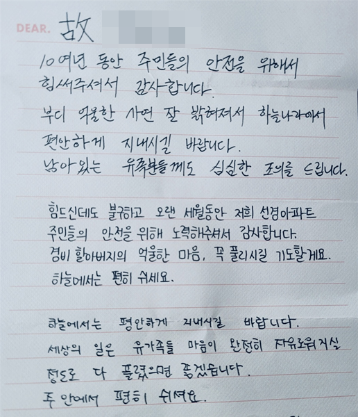 | ¡ã ¼±°æ¾ÆÆÄÆ® ÁֹεéÀº ¸ð±ÝµÈ ¼º±Ý°ú ÇÔ²² ¼ÕÆíÁö µîÀ» ¸ð¾Æ À§·ÎÀÇ ¸¶À½À» Àü´ÞÇß´Ù. <Á¦°ø=°³²±¸ÀÇȸ> |