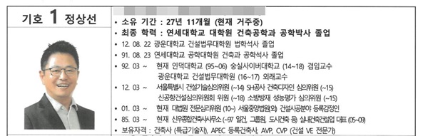 Á¶ÇÕÀå¿¡ ´ç¼±µÈ Á¤»ó¼± È帴 ¾à 28³â°£ ½Å¹ÝÆ÷4Â÷¸¦ ¼ÒÀ¯Çϰí ÇöÀç °ÅÁÖ ÁßÀÎ °ÍÀ¸·Î ¾Ë·ÁÁ³´Ù. ±¤¿î´ëÇб³ ¹ýÇм®»ç¿Í ¿¬¼¼´ëÇб³ °ÇÃà°øÇÐ ¹Ú»ç¤ý°ÇÃà»ç¸¦ °ÅÄ£ °ËÁõµÈ ÃÖ°íÀÇ °ÇÃà Àü¹®°¡¶õ Æò°¡¸¦ ¹Þ°í ÀÖ´Ù. ƯÈ÷ ±×´Â ¼¿ï½Ã °Ç¼³±â¼ú ½ÉÀÇÀ§¿øÀ» ¿ªÀÓÇÏ°í ´ë¹ý¿ø(°Ç¼³ºÐÀï) Àü¹®½É¸®À§¿øÀ» ¸Ã°í ÀÖ´Ù.