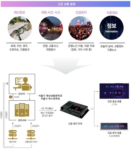 ½Ç½Ã°£ ±ä±Þ ¾È³»½Ã½ºÅÛÀº ¹ö½º¿¡ ž½ÂÇÑ ½Â°´µé¿¡°Ô °¢Á¾ Àç³Á¤º¸ ¹× ´ëÇü »ç°Ç¤ý»ç°í µîÀÇ »óȲÀ» ½Ç½Ã°£À¸·Î ¸Þ½ÃÁö À½¼º(TTS)°ú Àü±¤ÆÇ ¹®ÀÚ ¼ºñ½º·Î Á¦°øÇØ ½Â°´µéÀÌ ½Å¼ÓÇÏ°Ô ´ëÀÀÇÒ ¼ö ÀÖµµ·Ï ÇÑ´Ù. °¢Á¾ Áýȸ ¹× Çà»ç µîÀ¸·Î ¹ö½º ¿îÇà³ë¼± ÀÌÅ»À̳ª Â÷·®¿ìȸ µî°ú °°Àº °ü·ÃÇÑ Á¤º¸µµ ½Ç½Ã°£À¸·Î Á¦°øÇØ ºÒÆí¤ýÈ¥µ¿ÀÌ ÃÖ¼ÒÈÇÑ´Ù.