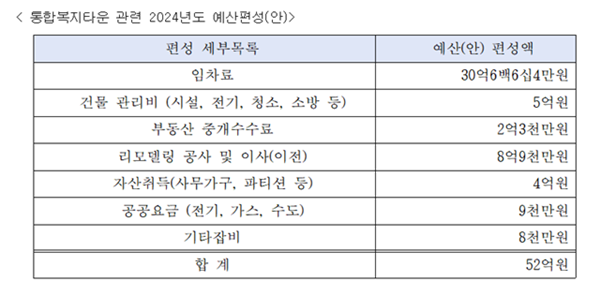 ¾È ÀÇ¿øÀº 2024³âµµ ÀϹÝȸ°è ¿¹»ê¾È Áß 52¾ï ¿øÀ¸·Î °¡Àå Å« ±Ý¾×À¸·Î Æí¼ºµÈ ±¸Ã»»ç ÅëÇÕº¹ÁöŸ¿î Á¶¼º »ç¾÷¿¡ ´ëÇØ ÁúŸÇß´Ù. ±¸Ã»»ç ÅëÇÕº¹ÁöŸ¿îÀº 2024³â 2¿ù ÁذøÀ» ¾ÕµÐ °Ç¹°À» ÀÓÂ÷ÇØ¼ º¹Áö»ýȰ±¹À» ÀÌÀüÇÑ´Ù´Â °èȹÀ¸·Î, ÀÓÂ÷·á 30¾ï660¸¸ ¿ø, °Ç¹° °ü¸®ºñ 5¾ï ¿ø, ºÎµ¿»ê Áß°³¼ö¼ö·á 2¾ï3000¸¸ ¿ø, ¸®¸ðµ¨¸µ °ø»ç ¹× À̻翡 8¾ï9000¸¸ ¿ø µî 52¾ï ¿øÀÇ ¿¹»ê¾ÈÀÌ Æí¼ºµÆ´Ù.