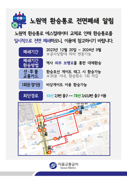 °ø»ç´Â À̸¦ À§ÇØ ¿À´Â 12¿ù 20ÀϺÎÅÍ 2024³â 9¿ù±îÁö ¾à 9°³¿ù°£ ȯ½ÂÅë·Î¸¦ Àü¸é Æó¼âÇÑ´Ù. ³ë¿ø¿ª¿¡¼ 4È£¼±°ú 7È£¼±À» °¥¾ÆÅ¸´Â °í°´Àº ¿ÜºÎ ÃâÀÔ±¸¸¦ ÀÌ¿ëÇÏ´Â ‘°£Á¢ ȯ½Â’ ¹æ½ÄÀ» ÀÌ¿ëÇØ¾ß ÇÑ´Ù.
