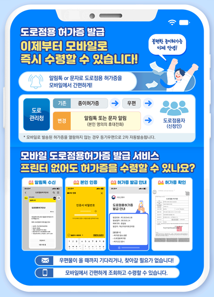 ¾ÕÀ¸·Î´Â ÀüÀÚ¹®¼ ÇüÅÂÀÇ µµ·ÎÁ¡¿ë Çã°¡ÁõÀ» ¸ð¹ÙÀÏ·Î ºü¸£°Ô ¹ß¼ÛÇØ ½ÅûÀÎÀÌ Çã°¡ÁõÀ» ±â´Ù¸®°Å³ª °ü¸®Ã»¿¡ ã¾Æ°¡Áö ¾Ê°íµµ ½±°Ô Á¶È¸Çϰųª ¼ö·ÉÇÒ ¼ö ÀÖ´Ù.