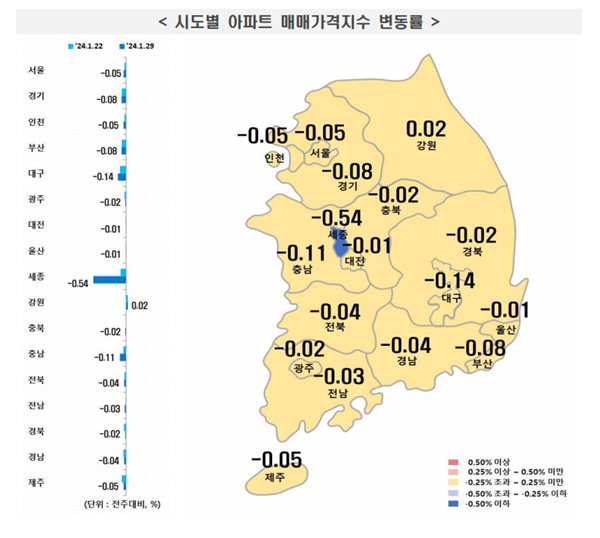 Áö¹æ(-0.04%)Àº ½Ã¤ýµµº°·Î ºÎ»ê(-0.06%), ´ëÀü(0.09%), ´ë±¸(-0.13%), Ãæ³²(-0.07%), ÃæºÏ(0.01%), °¿ø(0.03%), ±¤ÁÖ(-0.03%), ¿ï»ê(0.04%), ¼¼Á¾(-0.58%), Àü³²(0%), ÀüºÏ(0.04%), °æ³²(-0.03%), °æºÏ(-0.09%), Á¦ÁÖ(-0.04%) µîÀÇ °á°ú¸¦ º¸¿´´Ù. ¼¼Á¾Àº ½Å±Ô ÀÔÁÖ ¹°·® ¿µÇâ ¹× ¸Å¹° Àûü Áö¼ÓµÇ´Â »ê¿ï¤ýÁ¾ÃÌ À§ÁÖ·Î Ç϶ôÇß´Ù.