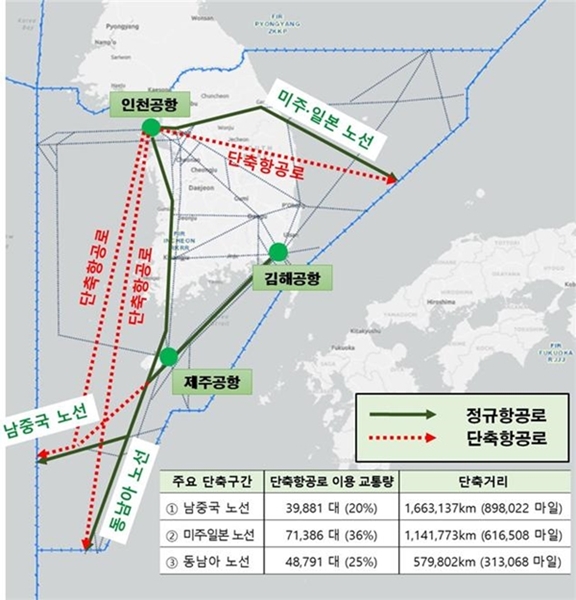 2022³â¿¡´Â ±¹Á¦¼± ÃÑ 27¸¸6356´ë Áß 9¸¸9115´ë°¡ ´ÜÃàÇ×°ø·Î¸¦ ÀÌ¿ëÇØ 214¸¸5710km¸¦ ´ÜÃàÇß´Ù. 2023³â¿¡´Â ±¹Á¦¼± ±³Åë·®ÀÇ Áõ°¡¿Í ±¹ÅäºÎ¤ý±¹¹æºÎ(°ø±º)¿ÍÀÇ ÇùÁ¶ ü°è À¯Áö·Î Àü³â ´ëºñ ´ÜÃà°Å¸®´Â 170¸¸7251km·Î 79.57% Áõ°¡Çϰí, ´ÜÃàÇ×°ø·Î ÀÌ¿ë·üÀº 36%·Î Àü³â°ú µ¿ÀÏÇÑ ¼öÁØÀ» À¯ÁöÇÑ °ÍÀ¸·Î ÆÄ¾ÇµÆ´Ù.