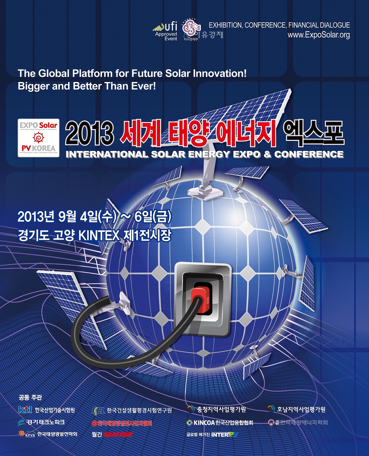 [¾ÆÀ¯°æÁ¦=¹ÚÁø¾Æ±âÀÚ]´ëÇѹα¹À» ¿¡³ÊÁö °ÆÁ¤ ¾ø´Â ¼¼»óÀ¸·Î ¾È³»ÇÒ ‘2013 ¼¼°è ÅÂ¾ç ¿¡³ÊÁö ¿¢½ºÆ÷’(Expo Solar 2013, www.ExpoSolar.org)°¡ 9¿ù 4ÀÏ(¼ö)~6ÀÏ(±Ý)±îÁö 3Àϰ£ ´ëÇѹα¹ °æ±âµµ ÀÏ»ê ŲŨ½º Á¦1Àü½ÃÀå¿¡¼ °³ÃֵȴÙ.