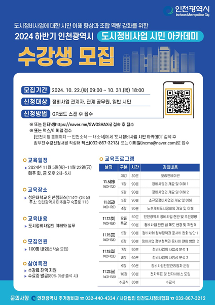 [¾ÆÀ¯°æÁ¦=Á¶¸íÀÇ ±âÀÚ] ÀÎõ±¤¿ª½Ã´Â ¿À´Â 11¿ù 5ÀϺÎÅÍ 22ÀϱîÁö û¿î´ëÇб³ ÀÎõķÆÛ½º¿¡¼ ‘2024³â ÇϹݱ⠵µ½ÃÁ¤ºñ»ç¾÷ ½Ã¹Î ¾ÆÄ«µ¥¹Ì’¸¦ ¿î¿µÇÑ´Ù°í ÃÖ±Ù ¹àÇû´Ù.