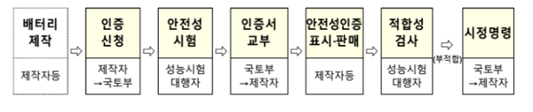 ¹èÅ͸® ¾ÈÀü¼º ÀÎÁõÁ¦´Â ±âÁ¸¿¡ Á¦Àۻ簡 ½º½º·Î ¾ÈÀü¼ºÀ» ÀÎÁõÇÏ´ø ÀÚ±âÀÎÁõ ¹æ½Ä¿¡¼ ¹þ¾î³ª Àü±âÂ÷ ¹èÅ͸®¿¡ ´ëÇØ¼´Â Á¤ºÎ°¡ Á÷Á¢ ¾ÈÀü¼ºÀ» »çÀü¿¡ ÀÎÁõÇÏ´Â Á¦µµ´Ù. ¹èÅ͸® À̷°ü¸®Á¦´Â °³º° ¹èÅ͸®¿¡ ½Äº°¹øÈ£¸¦ ºÎ¿©ÇØ À̸¦ ÀÚµ¿Â÷µî·Ï¿øºÎ¿¡ µî·ÏÇϵµ·Ï ÇÔÀ¸·Î½á Àü±âÂ÷ ¹èÅ͸®ÀÇ Á¦ÀÛºÎÅÍ ¿îÇà, ÆóÂ÷±îÁö Àü Áֱ⠹èÅ͸® ÀÌ·ÂÀ» °ü¸®ÇÏ´Â Á¦µµ´Ù.