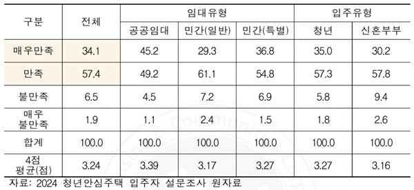 [¾ÆÀ¯°æÁ¦=Á¶¸íÀÇ ±âÀÚ] û³â¾È½ÉÁÖÅà ÀÔÁÖÀÚÀÇ 90% ÀÌ»óÀÌ ÇöÀçÀÇ ÁÖ°Åȯ°æ¿¡ ¸¸Á·Çϸç, ÀÌÁß °ø°øÀÓ´ë À¯Çü ÀÔÁÖÀÚÀÇ ¸¸Á·µµ°¡ ´õ Å« °ÍÀ¸·Î ³ªÅ¸³µ´Ù.