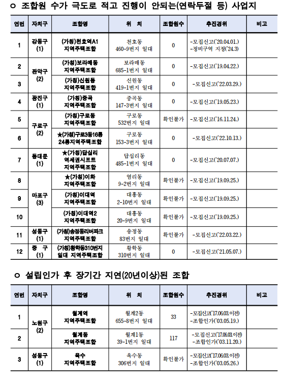¼¿ï½Ã´Â ÃÖ±Ù Á¶ÇÕ¼³¸³Àΰ¡ ÈÄ 20³â ÀÌ»ó »ç¾÷ÀÌ Áö¿¬µÈ Á¶ÇÕ 3°÷°ú ¸ðÁý ½Å°í ÀÌÈÄ ¿î¿µÀÌ ¾È µÈ ä·Î ¿¬¶ôÀÌ µÎÀýµÈ »ç¾÷Áö 12°÷¿¡ ´ëÇØ ±¸Ã»Àå Á÷±Ç Ãë¼Ò¸¦ ÃßÁøÇÑ´Ù°í ¹àÇû´Ù.