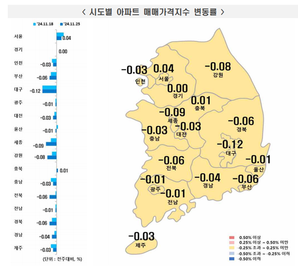 [¾ÆÀ¯°æÁ¦=±ÇÇýÁø ±âÀÚ] ÃÖ±Ù Çѱ¹ºÎµ¿»ê¿øÀÌ ¹ßÇ¥ÇÑ ‘ÁÖ°£¾ÆÆÄÆ® °¡°Ýµ¿Çâ’¿¡ µû¸£¸é 11¿ù 4ÁÖ(Áö³ 25ÀÏ ±âÁØ) Àü±¹ ¾ÆÆÄÆ®°ªÀº Ç϶ô(-0.02%)À» ±â·ÏÇß´Ù. ¼öµµ±ÇÀº »ó½ÂÆø À¯Áö, ¼¿ïÀº »ó½ÂÆø Ãà¼Ò, Áö¹æÀº Ç϶ôÆø È®´ëÇÑ »óȲÀÌ´Ù.