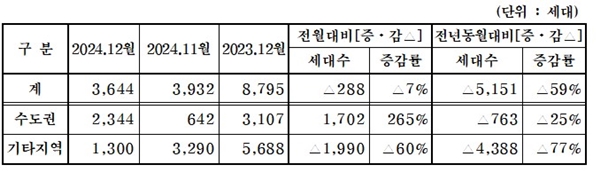 ÀÌ´Â Àü¿ù(3932°¡±¸)°ú ºñ±³ÇØ 288°¡±¸(7%) °¨¼ÒÇÑ ¼öÄ¡´Ù. Àü³â µ¿¿ù(8795°¡±¸) ´ëºñ·Î´Â 5151°¡±¸(59%)³ª ÁÙ¾ú´Ù.