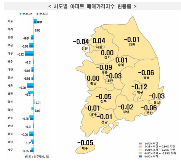 [¾ÆÀ¯°æÁ¦=±ÇÇýÁø ±âÀÚ] ÃÖ±Ù Çѱ¹ºÎµ¿»ê¿øÀÌ ¹ßÇ¥ÇÑ ‘ÁÖ°£¾ÆÆÄÆ® °¡°Ýµ¿Çâ’¿¡ µû¸£¸é 12¿ù 1ÁÖ(Áö³ 2ÀÏ ±âÁØ) Àü±¹ ¾ÆÆÄÆ®°ªÀº Ç϶ô(-0.02%)À» ±â·ÏÇß´Ù. ¼öµµ±Ç ¹× ¼¿ïÀº »ó½ÂÆø À¯Áö, Áö¹æÀº Ç϶ôÆø Ãà¼ÒÇÑ »óȲÀÌ´Ù.