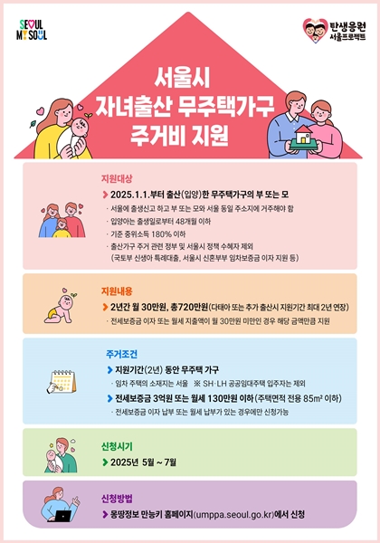 Áö¿ø ´ë»óÀº ¿ÃÇØ 1¿ù 1ÀÏ ÀÌÈÄ Ãâ»êÇÑ ¹«ÁÖÅà °¡±¸·Î, ±âÁØ ÁßÀ§¼Òµæ 180% ÀÌÇÏ¿©¾ß ÇÑ´Ù. Áְźñ Áö¿øÀ» ¹ÞÀ» ¼ö ÀÖ´Â ÁÖÅÃÀº ¼¿ï¿¡ ¼ÒÀçÇÑ Àü¼¼°¡ 3¾ï ¿ø ÀÌÇÏ ¶Ç´Â ¿ù¼¼ 130¸¸ ¿ø ÀÌÇÏ ÀÓÂ÷ÁÖÅÃÀ̾î¾ß Çϸç, ¼¿ïÁÖÅõµ½Ã°ø»ç(SH), Çѱ¹ÅäÁöÁÖÅðø»ç(LH)ÀÇ °ø°øÀÓ´ëÁÖÅà ÀÔÁÖÀÚ´Â Á¦¿ÜµÈ´Ù.
