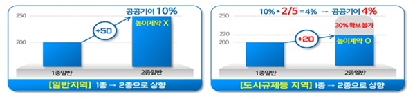 ¿¹¸¦ µé¾î Á¦1Á¾ÀϹÝÁÖ°ÅÁö¿ª(¹ýÀû»óÇÑ¿ëÀû·ü 200%)¿¡¼ Á¦2Á¾ÀϹÝÁÖ°ÅÁö¿ª(¹ýÀû»óÇÑ¿ëÀû·ü 250%)À¸·Î ¿ëµµÁö¿ªÀ» »óÇâÇÑ ±¸¿ªÀÇ °ÇÃà°¡´É ¿ëÀû·üÀÌ ³ôÀÌ Á¦¾à µîÀ¸·Î 220%¹Û¿¡ µÇÁö ¾Ê´Â´Ù¸é, Á¾»óÇâÀ¸·Î Ãß°¡ È®º¸µÈ ¿ëÀû·ü ºñÀ²(20%)¸¸Å¸¸ Àǹ« °ø°ø±â¿©¸¦ ºÎ´ãÅä·Ï ÇÏ´Â °ÍÀÌ´Ù. ÀÌ °æ¿ì °ø°ø±â¿©À²Àº 10%°¡ ¾Æ´Ñ 4%À̸ç, »ç¾÷ ¸éÀû(ȹÁö)À» 4¸¸ §³·Î °¡Á¤ÇÑ´Ù¸é ºÐ¾ç°¡´É °¡±¸¼ö°¡ ¾à 15°¡±¸ ´Ã¾î³ª°Ô µÈ´Ù.