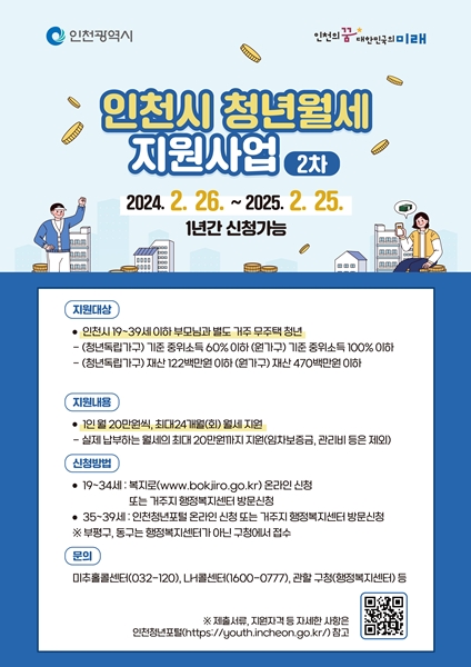[¾ÆÀ¯°æÁ¦=Á¶¸íÀÇ ±âÀÚ] ÀÎõ±¤¿ª½Ã´Â Àú¼Òµæ û³âÀ» ´ë»óÀ¸·Î û³â¿ù¼¼ Áö¿ø»ç¾÷ 2Â÷ ½ÅûÀ» ¹Þ´Â´Ù°í ÃÖ±Ù ¹àÇû´Ù.