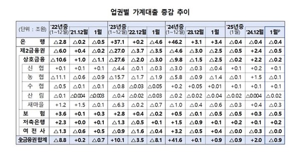 ±ÝÀ¶À§¿øÈ¸¿Í ±ÝÀ¶°¨µ¶¿øÀÌ ÀÌ´Þ 12ÀÏ ¹ßÇ¥ÇÑ ‘2025³â 1¿ù °¡°è´ëÃâ µ¿Çâ(ÀáÁ¤)’¿¡ µû¸£¸é Áö³ 1¿ù Àü ±ÝÀ¶±Ç °¡°è´ëÃâÀº Àü¿ù¿¡ ºñÇØ 9000¾ï ¿ø ÁÙ¾ú´Ù.