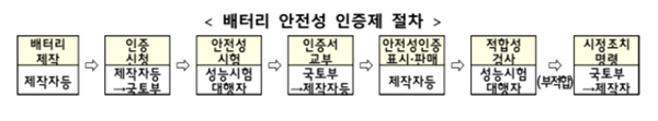¹èÅ͸®¾ÈÀü¼ºÀÎÁõÁ¦´Â ±âÁ¸¿¡ Á¦Àۻ簡 ½º½º·Î ¾ÈÀü¼ºÀ» ÀÎÁõÇÏ´ø ÀÚ±âÀÎÁõ ¹æ½Ä¿¡¼ ¹þ¾î³ª, Àü±âÂ÷ ¹èÅ͸®¿¡ ´ëÇØ¼´Â Àü±âÂ÷¿¡ žÀç¤ýÆÇ¸ÅÇϱâ Àü¿¡ Á¤ºÎ°¡ Á÷Á¢ ½ÃÇèÀ» °ÅÃÄ ¾ÈÀü¼ºÀ» ÀÎÁõÇÏ´Â Á¦µµ´Ù.