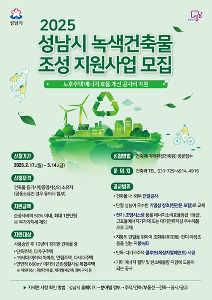 Áö³ 21ÀÏ ¼º³²½Ã´Â °ÇÃ๰ÀÇ ¿Â½Ç°¡½º ¹èÃâ·®À» ÁÙÀ̰í Áö¼Ó °¡´ÉÇÑ ³ì»ö°ÇÃ๰À» Á¶¼ºÇϱâ À§ÇØ ‘2025³â ³ì»ö°ÇÃ๰ Á¶¼º Áö¿ø»ç¾÷’À» ½ÃÇà, ¿ÃÇØ 3¿ù 14ÀϱîÁö ½ÅûÀ» ¹Þ´Â´Ù°í ¹àÇû´Ù.