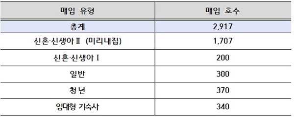 ¿ÃÇØ ¸ÅÀÔÇÏ´Â 2971°¡±¸´Â ½ÅÈ¥¥°¤ý½ÅÈ¥¥±(¹Ì¸®³»Áý ¿¬°èÇü), ÀϹÝ, û³â, ÀÓ´ëÇü ±â¼÷»ç µî 5°³ À¯ÇüÀÌ´Ù. ÀÌÁß ¹Ì¸®³»Áý ¿¬°èÇüÀÎ ½ÅÈ¥¥± À¯ÇüÀÌ Àüü ¸ñÇ¥ ¹°·®ÀÇ ¾à 60%ÀÎ 1707°¡±¸¿¡ ´ÞÇÑ´Ù.