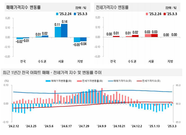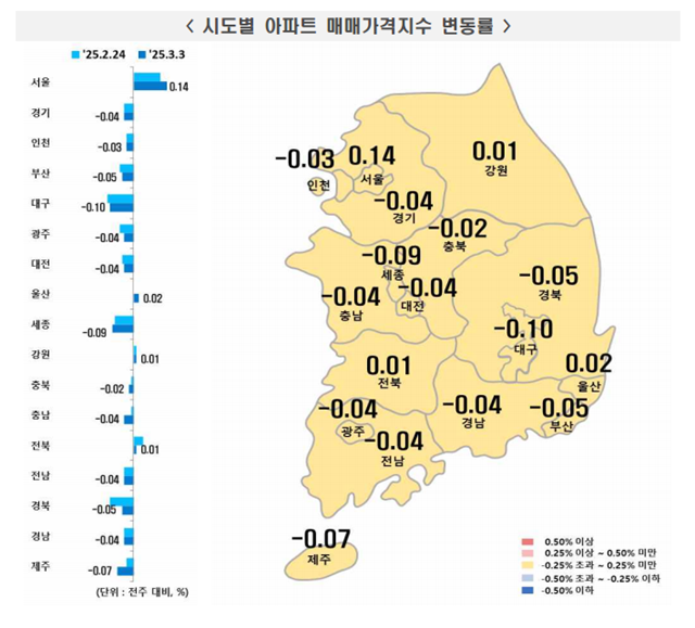 [¾ÆÀ¯°æÁ¦=±ÇÇýÁø ±âÀÚ] ÃÖ±Ù Çѱ¹ºÎµ¿»ê¿øÀÌ ¹ßÇ¥ÇÑ ‘ÁÖ°£¾ÆÆÄÆ® °¡°Ýµ¿Çâ’¿¡ µû¸£¸é 2025³â 3¿ù 1ÁÖ(Áö³ 3ÀÏ ±âÁØ) Àü±¹ ¾ÆÆÄÆ®°ªÀº Ç϶ô(-0.01%)À» ±â·ÏÇß´Ù. ¼öµµ±Ç ¹× ¼¿ïÀº »ó½ÂÆø È®´ë, Áö¹æÀº Ç϶ôÆø Ãà¼ÒÇÑ »óȲÀÌ´Ù.