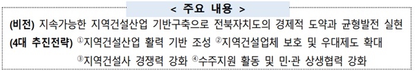 Á¾ÇÕ°èȹÀº ‘Áö¼Ó °¡´ÉÇÑ Áö¿ª °Ç¼³»ê¾÷ ±â¹Ý±¸ÃàÀ» ÅëÇÑ °æÁ¦Àû µµ¾à ½ÇÇö’À» ºñÀüÀ¸·Î Çϸç, 4´ë ÇÙ½É Àü·«À¸·Î ¡ãÁö¿ª °Ç¼³»ê¾÷ Ȱ·Â ±â¹Ý Á¶¼º ¡ãÁö¿ª¾÷ü º¸È£ ¹× ¿ì´ëÁ¦µµ È®´ë ¡ãÁö¿ª°Ç¼³»ç °æÀï·Â °È ¡ã¼öÁÖ Áö¿ø ¹× ¹Î¤ý°ü »ó»ý Çù·Â °È µîÀÇ ³»¿ëÀ» ´ã°í ÀÖ´Ù.