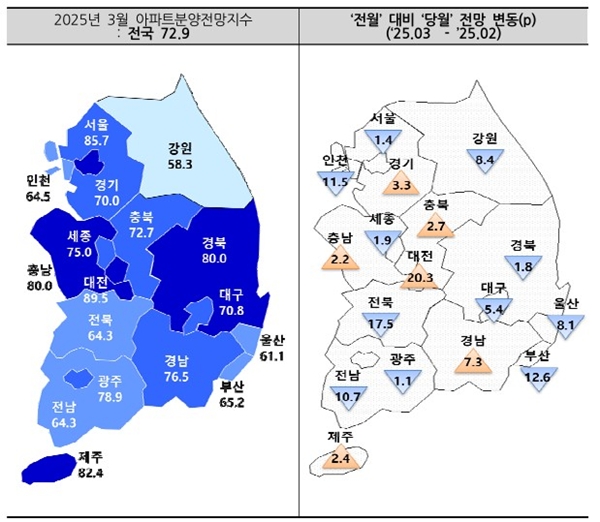 ÃÖ±Ù ÁÖÅûê¾÷¿¬±¸¿ø(ÀÌÇÏ Áֻ꿬)ÀÌ ÁÖÅûç¾÷ÀÚ¸¦ ´ë»óÀ¸·Î ¼³¹®Á¶»çÇÑ °á°ú ¿ÃÇØ 3¿ù ¾ÆÆÄÆ® ºÐ¾çÀü¸ÁÁö¼ö´Â Àü±¹ Æò±Õ 2.5p Ç϶ôÇÑ 72.9·Î ³ªÅ¸³µ´Ù. Àü¸ÁÁö¼ö°¡ 100À» ÃʰúÇÏ¸é ºÐ¾ç Àü¸ÁÀÌ ±àÁ¤Àû, 100 ¹Ì¸¸ÀÌ¸é ºÎÁ¤ÀûÀ̶ó´Â Àǹ̴Ù.