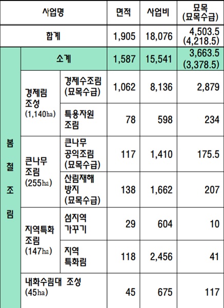 Á¶¸²»ç¾÷Àº »ê¸²ÀÇ °æÁ¦Àû¤ý°øÀÍÀû °¡Ä¡ÀÇ Çâ»ó, ±âÈĺ¯È ´ëÀÀ, ź¼ÒÈí¼ö¿ø È®ÃæÀ» À§ÇØ ½ÃÇàµÇ´Â »ç¾÷À¸·Î, ¿ÃÇØ µµ´Â ¡ã°æÁ¦¸² Á¶¼º(1442ha) ¡ãÅ«³ª¹« Á¶¸²(261ha) ¡ãÁö¿ªÆ¯È Á¶¸²(147ha) ¡ã³»È¼ö¸²´ë Á¶¼º(55ha) µî¿¡ ÁýÁßÇÒ ¿¹Á¤ÀÌ´Ù.