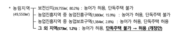 ³ó¸²Áö¿ªÀº ´ëºÎºÐ º¸Àü»êÁö(80.2%)¿Í ³ó¾÷ÁøÈïÁö¿ª(18.7%)À¸·Î ³ª´µ´Âµ¥, °¢°¢ ¡¸»êÁö°ü¸®¹ý¡¹°ú ¡¸³óÁö¹ý¡¹ÀÇ ±ÔÁ¦¸¦ ¹Þ´Â´Ù. À̵é Áö¿ª¿£ ³ó¤ý¾î¾÷ Á¾»çÀÚ¸¸ ´Üµ¶ÁÖÅÃÀ» ÁöÀ» ¼ö ÀÖ¾î, ½ÇÁ¦ À̹ø ±ÔÁ¦°¡ Àû¿ëµÇ´Â ³ó¸²Áö¿ªÀº Àüü ¸éÀû Áß ¡¸³óÁö¹ý¡¹¿¡ Àû¿ëÀ» ¹ÞÁö ¾Ê´Â ‘±× ¿Ü Áö¿ª’¿¡ ÇØ´çÇÏ´Â 1.2%ÀÌ´Ù.