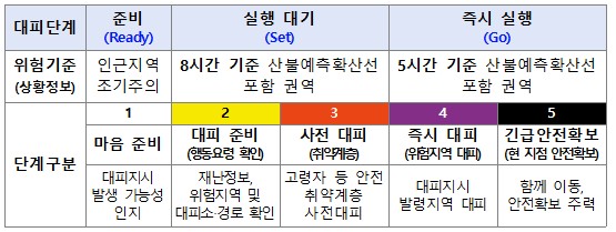 ÀÌ¿¡ Á¤ºÎ´Â ÇàÁ¤¾ÈÀüºÎ, »ê¸²Ã» µî°ú ÇÔ²² Æò±Õdz¼Ó»Ó¸¸ ¾Æ´Ï¶ó ÃÖ´ë¼ø°£Ç³¼Óµµ °í·ÁÇØ »êºÒÈ®»ê¿¹Ãø½Ã½ºÅÛÀ» ÀÛ¼ºÇϰí, À̸¦ Åä´ë·Î ÁֹδëÇÇ °¡À̵å¶óÀÎÀ» ¸¶·ÃÇß´Ù. ¿¹Ãø °á°ú ȼ±µµ´Þ°Å¸® 5½Ã°£ À̳» ‘À§Ç豸¿ª’ ÁÖ¹ÎÀº Áï½Ã ´ëÇÇÇϰí, 8½Ã°£ À̳»´Â ‘ÀáÀçÀû À§Ç豸¿ª’À¸·Î Á¤ÇØ ´ëÇÇ Áغñ¸¦ Çϵµ·Ï Çß´Ù.