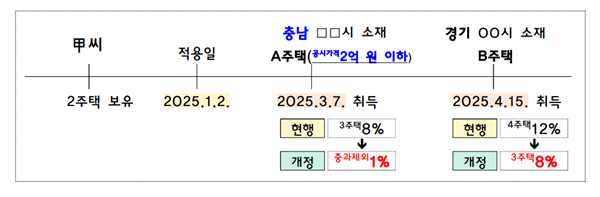 °³Á¤¾È¿¡ µû¸£¸é ¿ÃÇØ 1¿ù 2ÀÏ ÀÌÈÄ Áö¹æ¿¡ ¼ÒÀçÇÑ °ø½Ã°¡°Ý 2¾ï ¿ø ÀÌÇÏÀÇ ÁÖÅÃÀ» À¯»ó ±¸ÀÔÇÑ °æ¿ì, Ãëµæ¼¼ »êÁ¤ ½Ã ±âÁ¸ º¸À¯ ÁÖÅà ¼ö¿Í °ü°è¾øÀÌ Áß°ú¼¼À²(8%¤ý12%)À» Àû¿ëÇÏÁö ¾Ê°í ±âº»¼¼À²(6¾ï ¿ø ÀÌÇÏ 1%)À» Àû¿ëÇÑ´Ù.