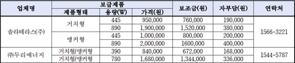 ¼³Ä¡ ºñ¿ëÀº Á¦Ç°ÇüÅ ¹× ¿ë·®¿¡ µû¶ó 84¸¸ ¿ø~100¸¸ ¿ø(390W ¶Ç´Â 445W ¸ðµâ 1Àå ±âÁØ)ÀÌ ¼Ò¿äµÇ´Âµ¥, ½Ã·ÎºÎÅÍ 80%¸¦ Áö¿ø¹ÞÀ¸¸é Àںδã±ÝÀº 16¸¸8000¿ø~20¸¸ ¿øÀÌ´Ù.