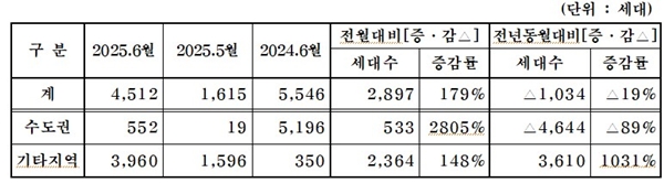 ÀÌ´Â Àü¿ù(1615°¡±¸) ´ëºñ 2897°¡±¸(179%) Áõ°¡ÇßÀ¸³ª, Àü³â µ¿¿ù(5546°¡±¸) ´ëºñ 1034°¡±¸(19%) °¨¼ÒÇÑ ¼öÄ¡´Ù.