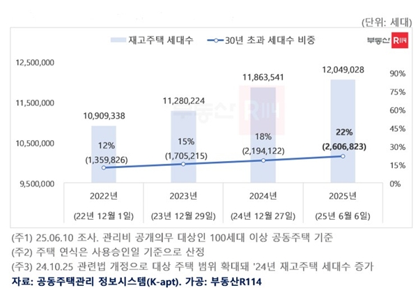 ÃÖ±Ù ºÎµ¿»êR114¿¡ µû¸£¸é °øµ¿ÁÖÅðü¸® Á¤º¸½Ã½ºÅÛ(K-apt) ÀڷḦ ºÐ¼®ÇÑ °á°ú ¿ÃÇØ Àü±¹ 30³â Ãʰú ³ëÈÄ ÁÖÅÃÀº 260¸¸6823°¡±¸·Î ÀüüÀÇ 22%¸¦ Â÷ÁöÇÏ´Â °ÍÀ¸·Î ³ªÅ¸³µ´Ù. 30³â Ãʰú ³ëÈÄ ÁÖÅà ºñÁßÀº 2022³â 12%(135¸¸9826°¡±¸), 2023³â 15%(170¸¸5215°¡±¸), 2024³â 18%(219¸¸4122°¡±¸)·Î °è¼Ó Áõ°¡ÇÏ´Â Ãß¼¼´Ù.