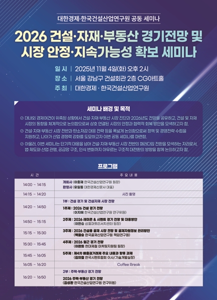 ¡ã ‘2026 °Ç¼³¤ýÀÚÀç¤ýºÎµ¿»ê °æ±âÀü¸Á ¹× ½ÃÀå ¾ÈÁ¤¤ýÁö¼Ó°¡´É¼º È®º¸ ¼¼¹Ì³ª’ Æ÷½ºÅÍ. <Á¦°ø=Çѱ¹°Ç¼³»ê¾÷¿¬±¸¿ø> |