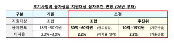 ±¹ÅäºÎ´Â »ç¾÷ Ãʱâ ÀÚ±Ý Á¶´Þ¿¡ ¾î·Á¿òÀ» °Þ´Â °¢ Á¶ÇÕ¿¡ »ç¾÷ºñ¸¦ Àú¸® À¶ÀÚÇÏ´Â ÃʱâÀÚ±Ý À¶ÀÚ »óǰÀÇ Áö¿ø ´ë»ó¿¡ ÃßÁøÀ§¸¦ Ãß°¡Çϰí, À¶ÀÚÇѵµ¸¦ ±âÁ¸ 18~50¾ï ¿ø¿¡¼ Á¶ÇÕ 30~60¾ï ¿ø¤ýÃßÁøÀ§ 10~15¾ï ¿øÀ¸·Î »óÇâ ¶Ç´Â ½Å¼³ÇÑ´Ù. ÀÌÀÚÀ²Àº ±âÁ¸ 2.2~3%¿¡¼ 2.2%·Î ÀÎÇÏÇÑ´Ù.